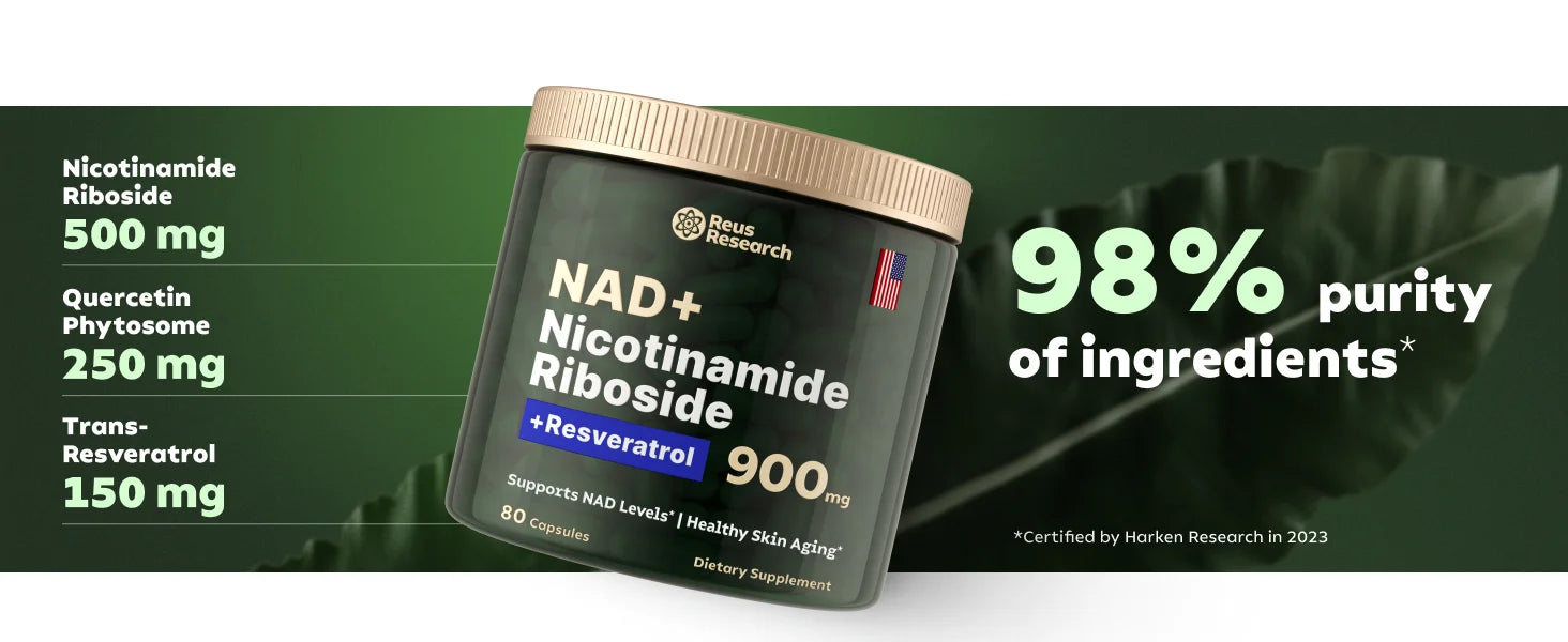 Reus Research NR900 is an all-in-one anti-aging NAD+ supplement designed to support skin aging, enhance energy levels, and boost focus. It contains Nicotinamide Riboside, Resveratrol, and Quercetin, delivered through advanced liposomal technology for superior absorption.